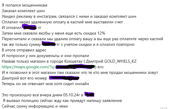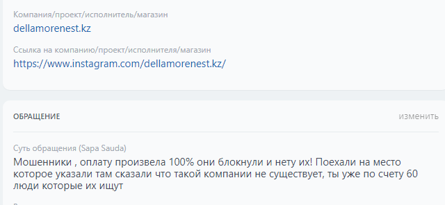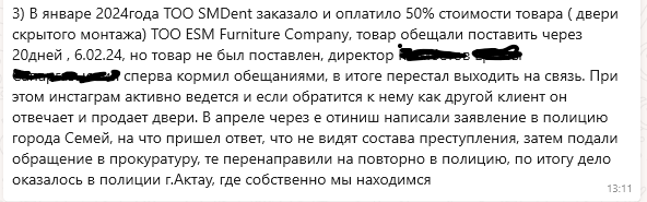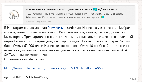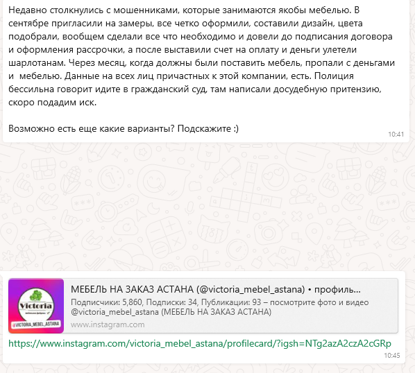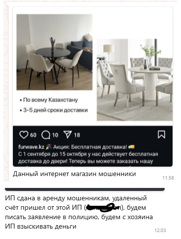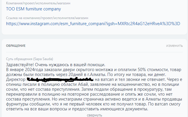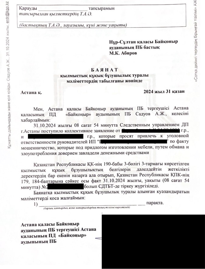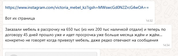 • Адрес мебельного магазина: г. Кызылорда, ул. Татимбета Булгакулы, 5В (осуществлен выезд по адресу, дома с такой нумерацией не существует, рядом склад, работник склада пояснил что часто приходят потерпевшие которых обманул мебельный магазин)