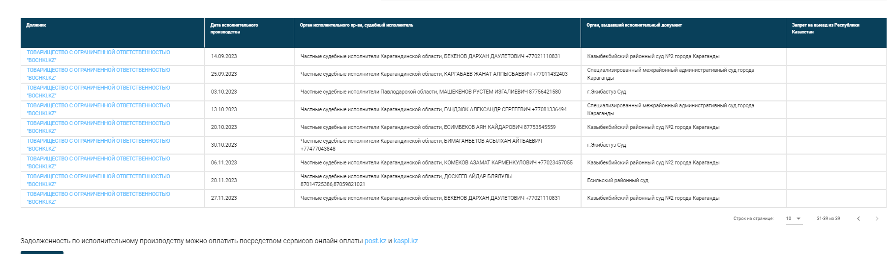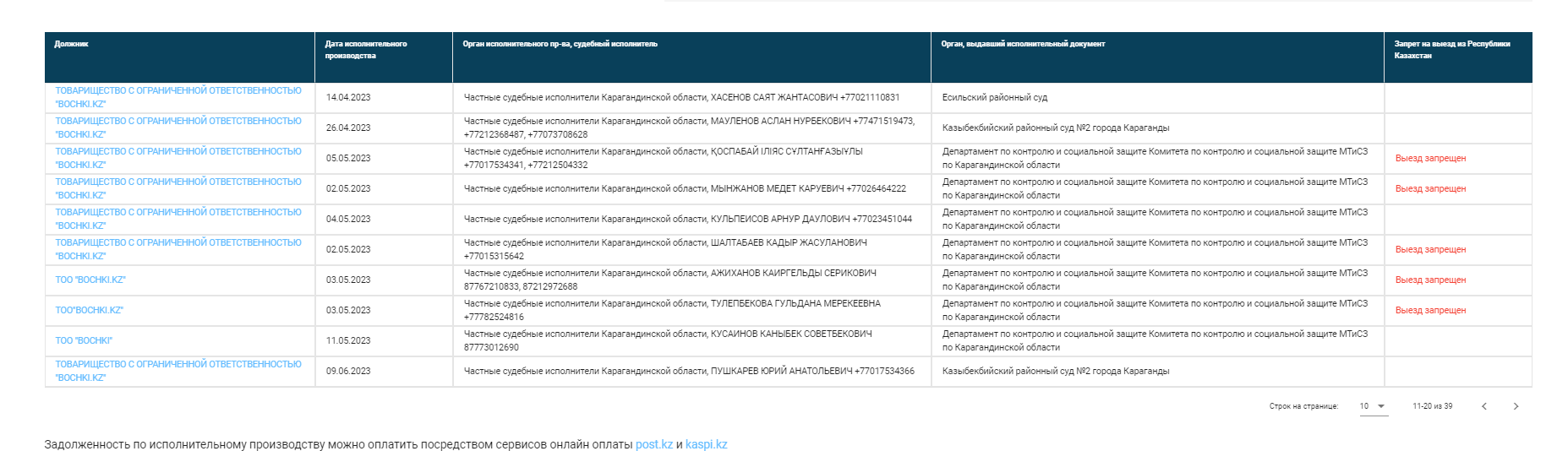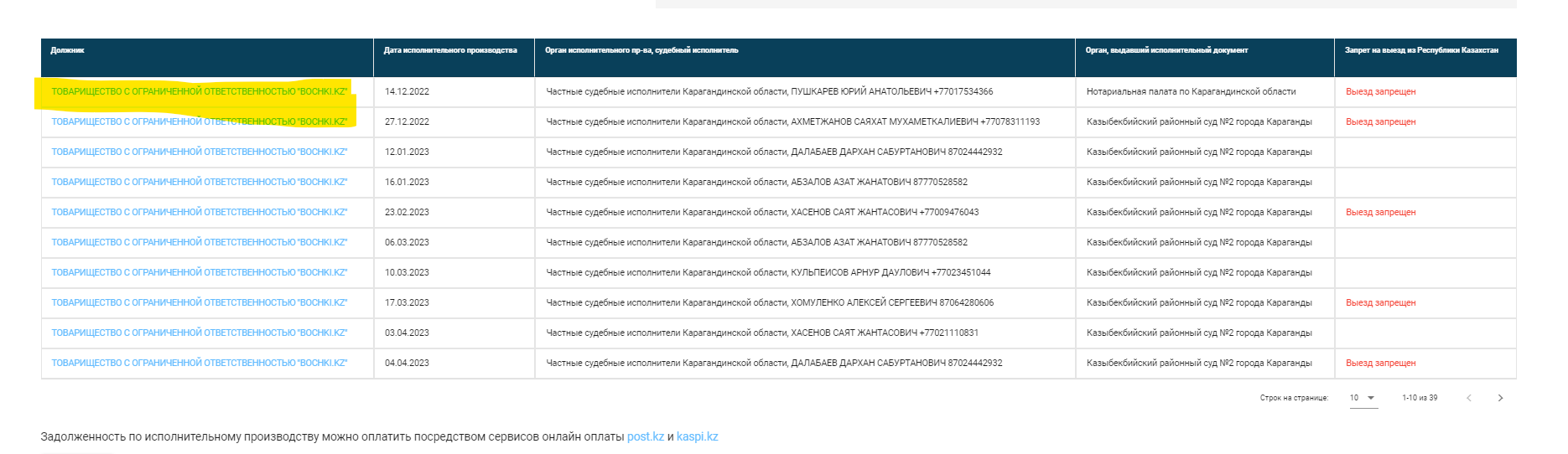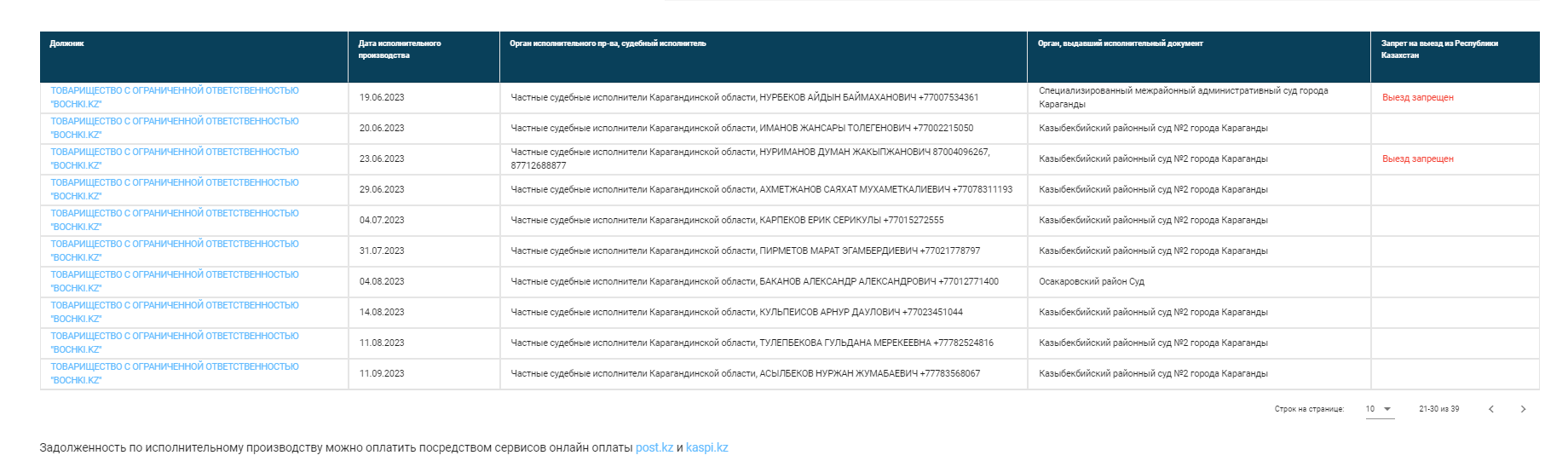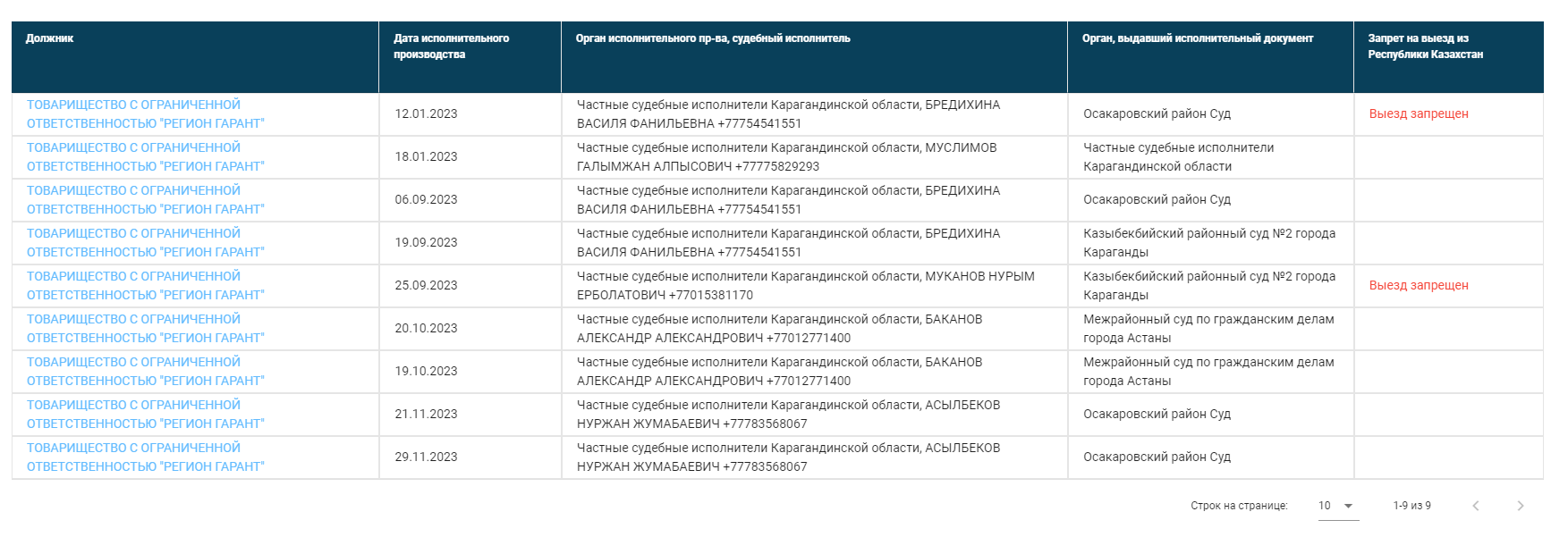 В настоящее время по данному Подрядчику возбуждено много исполнительных производств, Вы можете ознакомиться на сайте https://aisoip.adilet.gov.kz/debtors