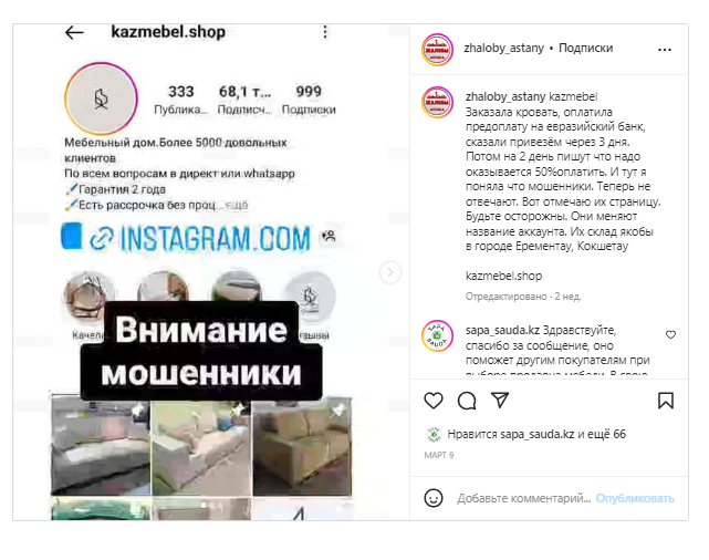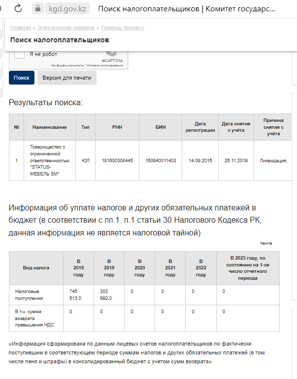 Продавец представляется компанией - ТОО "Status-Мебель SM" БИН 150940011403, которая согласно сведениям Комитета гос.доходов РК ликвидирована в 2019 году.